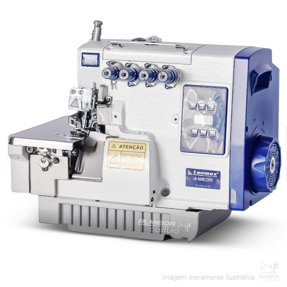 A LANMAX LM-664D é uma overloque industrial Direct Drive com ponto cadeia, equipada com 2 agulhas, 4 linhas, parada de agulha automática, control box e painel de comando embutido.