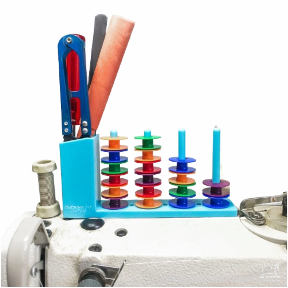 Utilize o suporte próximo à máquina de costura ou em uma superfície metálica para facilitar o acesso às bobinas durante o trabalho. Manter as bobinas organizadas ajuda a agilizar a troca de cores e melhorar a produtividade.